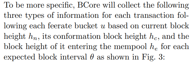 – PreProcessing process. When dealing with the historical confirmation information, BCore believes that recent blocks can provide more accurate information than older blocks. The influence is precisely described as an exponentially weighted moving trend. When a new block is formed, the old blocks’ impact fades at a set rate[9]. Considering that feerate values are continuous, BCore utilizes a feerate technique similar to BtcFlow, a trade-off between estimation precision and processing complexity. It uses the term ’bucket’ to define a feerate scale (starting at 1), and instead of examining each feerate value, it looks at the confirmation information for each feerate scale (bucket).