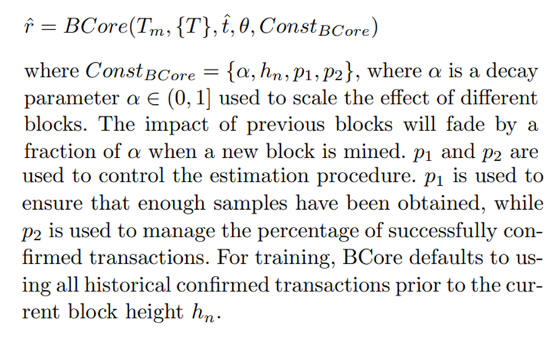 BCore[3] is what the community calls the codebase used to control the currency. It gives an estimate of the transaction feerate for a given block interval. Similar to BtcFlow, BCore seeks out the lowest feerate to ensure that transactions are confirmed within the specified timeframe. The distinction is that BCore pays more attention to historical transactions that have been recorded in the blockchain. It argues that by combining the feerates of prior transactions confirmed within the same block interval, an expected feerate may be determined. Meanwhile, when computing the estimation, BCore considers the records in recent blocks to be more useful than those in previous blocks.