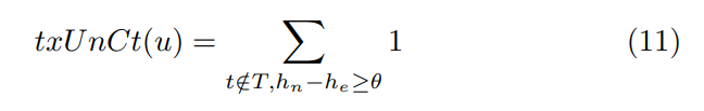 – Overall unconfirmed counts (txUnCt), which is the number of transactions that have not been confirmed and have waited more than θ at the current block height.