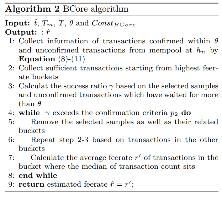 To be specific, BCore will begin collecting transactions from the highest feerate bucket first, then add transactions from lower buckets until enough samples have been obtained. The success ratio of those selected transactions will then be calculated. If the ratio γ is greater than the success confirmation ratio p2, BCore will empty the current selected transaction collection and begin collecting sufficient samples from the next buckets (lower feerate bucket) until the ratio fails the test (p2 in Algorithm 2). BCore will examine the feerate in the last pass transaction collection if it fails the test. Finally, BCore will return the average feerate in the bucket u, which is where the median transaction count of the selected transaction collection is located.